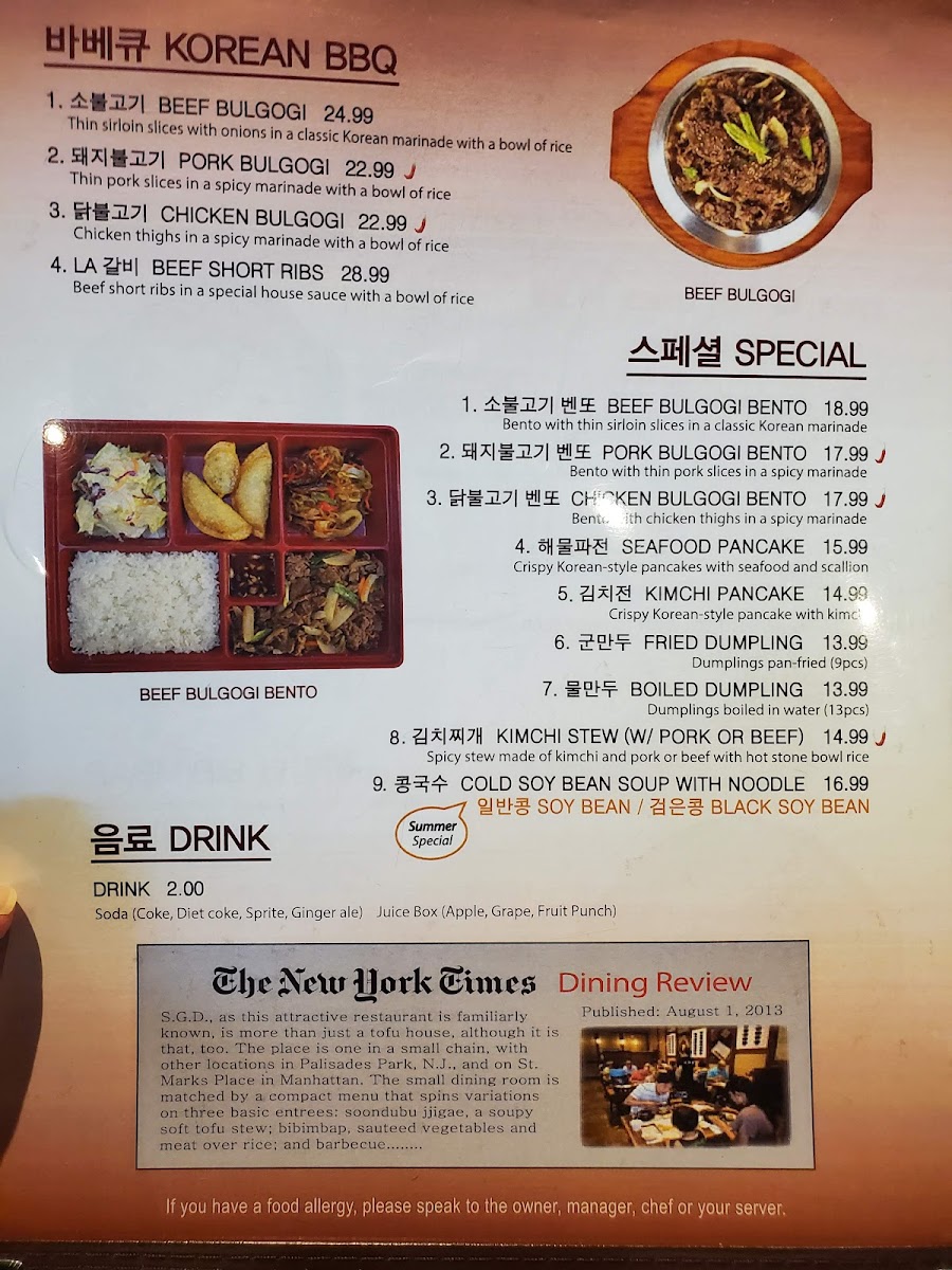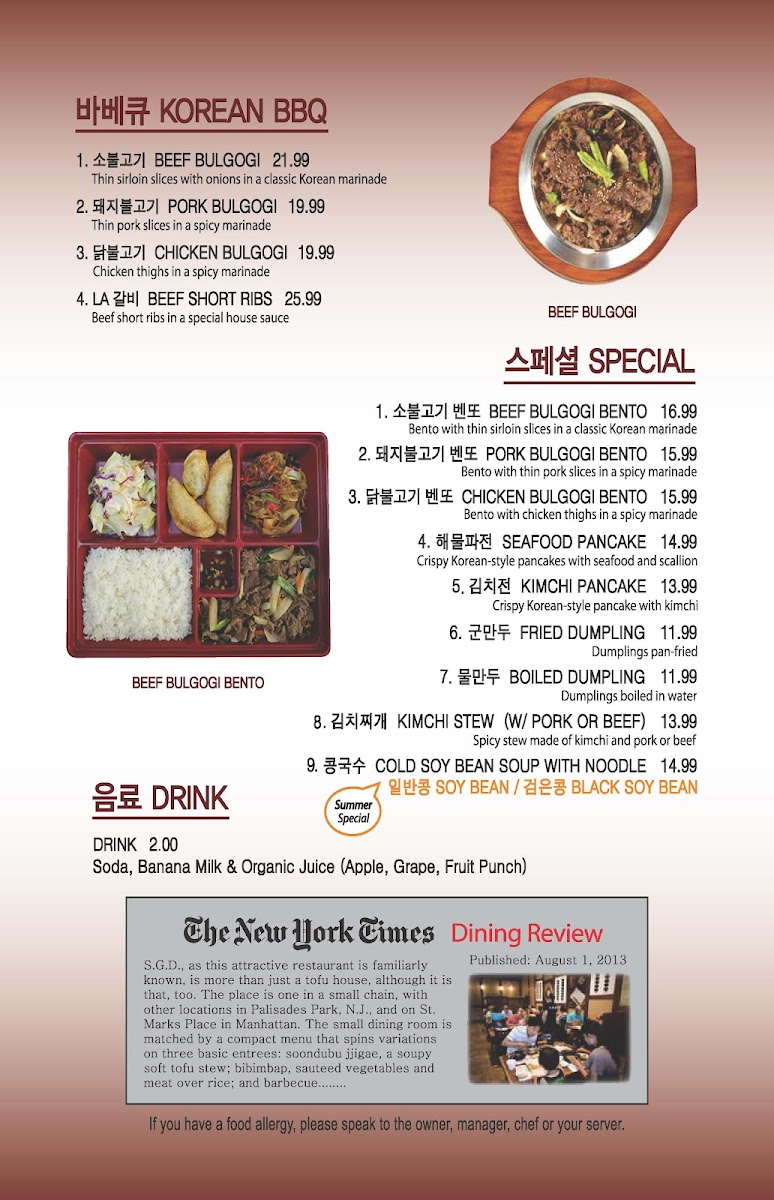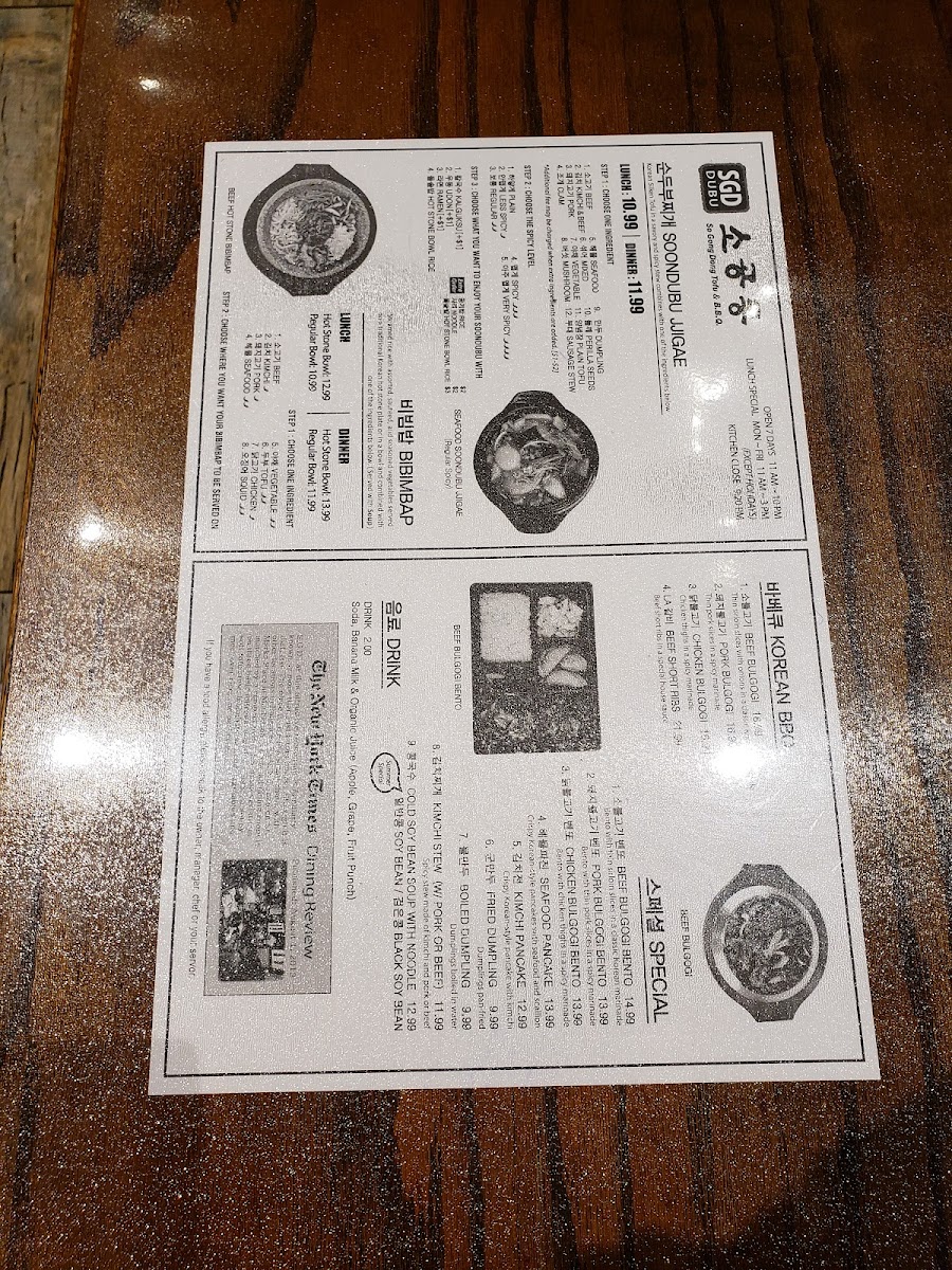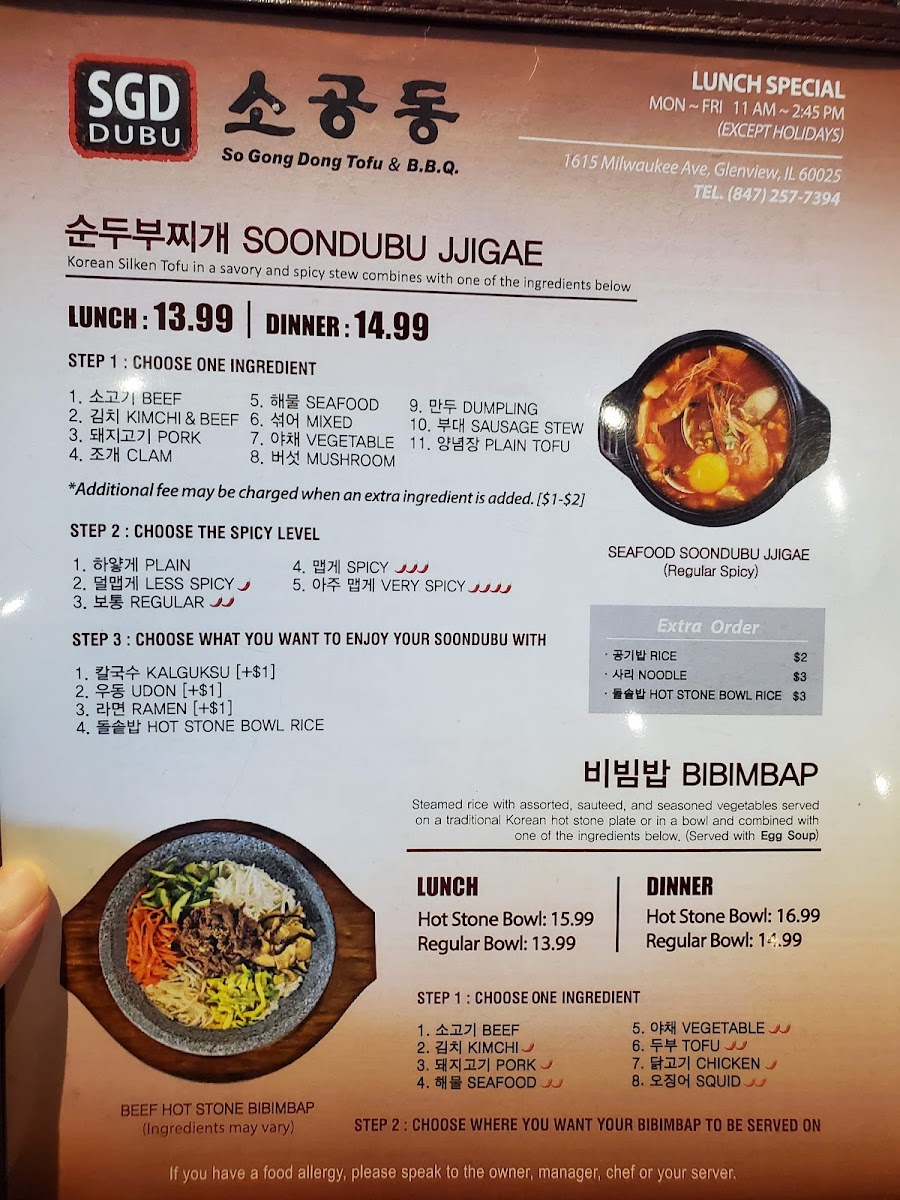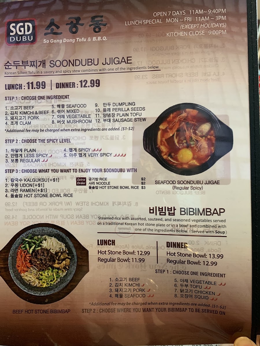 Welcome to SGD DUBU SO GONG DONG TOFU & KOREAN BBQ in Glenview, where authentic Korean flavors come alive! Located at 1615 Milwaukee Ave, this gem specializes in the beloved Soondubu Jjigae, a rich and spicy silken tofu stew that offers customizable ingredients for a personalized touch, with prices starting at US$18.99.
